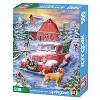 Capture the charm of a snowy holiday scene with this delightful 500 piece adult jigsaw puzzle featuring a rustic Christmas farm. The image showcases a classic red pickup truck, dusted with snow and adorned with a festive wreath, as it carries a freshly cut Christmas tree. A playful golden retriever enjoys the winter wonderland, while a cozy red barn and a cheerful snowman complete the heartwarming scene. Perfect for the holiday season, this puzzle brings the warmth and nostalgia of a country Christmas to life, offering a joyful and festive challenge for all ages.