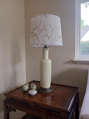 Graceful blooms and branches decorate the surface of this charming hardback drum lamp shade. Constructed with linen blend fabric, its embroidered pattern boasts a pretty branch and floral theme on a beige background. An unlined design and rolled trim complete elegant design elements. By the Springcrest Collection brand of lamp shades.