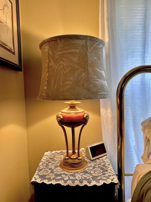 A classic botanical print is upgraded with warm hues of beige and gold on this modern softback drum lamp shade. Its subtle hourglass profile is refined and elegant, while subtle patterns add dimension and depth to any table lamp. The shade is complete with self fold trim for a classic, tailored look and a harp and finial are each included.