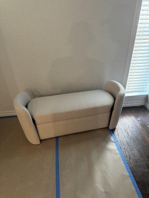 This is a great ottoman. It’s large, easy to put together and is sturdy and feels well made. It’s a little less bright white than displayed, but it’ll still look great in my house. The cushions are comfy to sit on too making it cute and functional seating. I do wish it had storage, but it’s great even without it!
