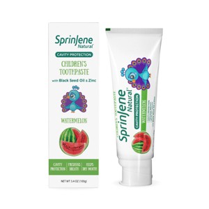 Delight your child’s senses with the juicy taste of SprinJene Natural® Watermelon Toothpaste! This fluoride-based formula helps fight cavities and strengthen enamel, while our patented Black Seed Oil and Zinc work together to support overall oral wellness. Safe, effective, and delicious—this toothpaste makes healthy smiles a breeze.