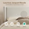 The upholstered bed frame is wrapped in soft, waterproof boucle-style jacquard fabric for both comfort and easy maintenance. Constructed from rubberwood and engineered wood, this durable headboard platform bed features seven solid legs for exceptional stability. The slatted base supports all mattress types, while EVA foam sound insulation in the middle rail ensures a quiet, peaceful sleep experience. This contemporary platform bed features a wide panel headboard and clean-lined frame, supported by rounded pillar legs that add contemporary geometric elegance