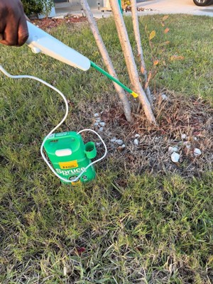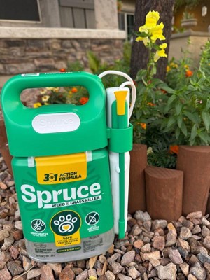 Spruce Weed & Grass Killer is the hard working, worry-free weed solution. Spruce is safe for use around people, pets & bees when used as directed. Spruce is a fast-acting weed killer that works on contact, with visible results in 1 hour, dead weeds in 1 day. The powerful formula works differently than most weed killers, using dehydration to kill weeds and should be sprayed on the entire plant, not just the root. Spruce also prevents regrowth. Spruce kills all types of weeds and grasses, including dandelions, large crabgrass, white clover, dollarweed, and morning glory. The reusable, battery-operated, Power Spray wand delivers an easy, continuous spray that is great for jobs big and small, such as maintenance of mulch beds, driveways, and paver stones; it is not designed for use on lawns. Each 64oz bottle can treat up to 400 weeds. Spruce is also backed by the Good Housekeeping seal.