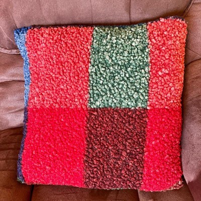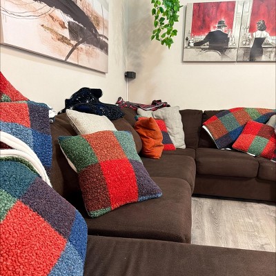 Add cozy style to your living space with this Square Chalet Plaid Printed Boucle Throw Pillow from Room Essentials™. This 18-inch square pillow showcases a fuzzy boucle surface adorned with a vibrant chalet plaid pattern in warm, inviting colors that complement any seasonal decor. Featuring a soft fabric exterior and a well-filled interior, the decorative pillow adds plenty of comfort and festive style to your sofa, couch, bench or bed.