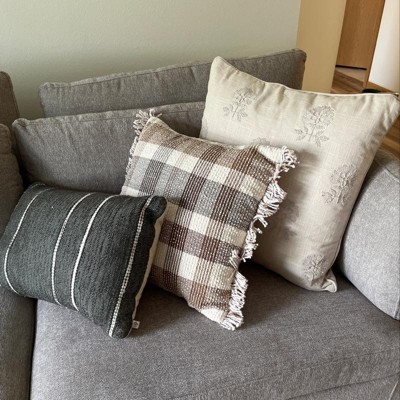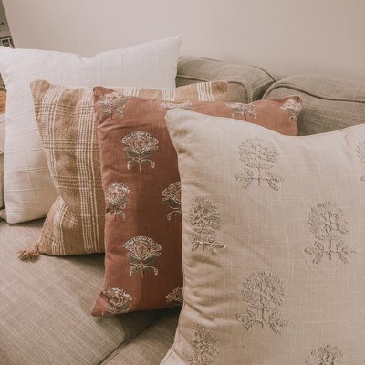 Lend artful appeal to your decor with this Square Embroidered Floral Decorative Throw Pillow in Light Beige from Threshold™. This decorative throw pillow features a floral embroidered pattern with leaves to add a decorative touch to your decor. Featuring a removable cover with hidden zipper for a finished look, this square throw pillow is made from 100% cotton fabric to offer soft comfort whether you place it on a sofa, couch or an armchair.