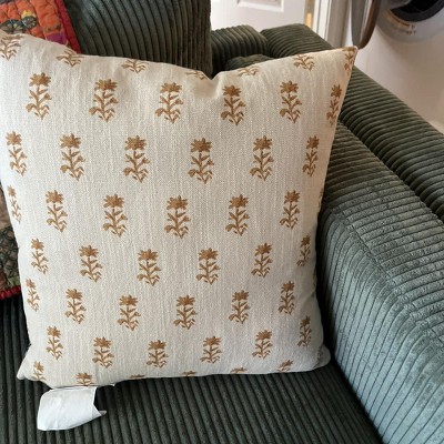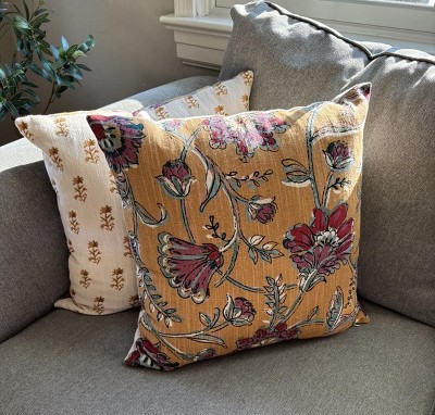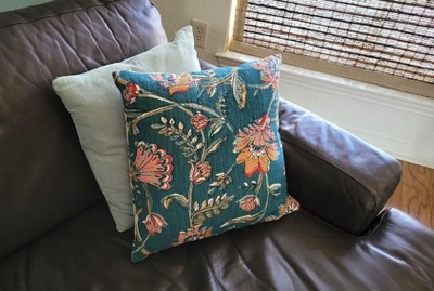 Spruce up your home furnishings with this Square Floral Pillow with Block-Print Reverse from Threshold™. This 18-inch square pillow showcases a reversible design with a vibrant floral-print front and beige reverse with floral block prints in dark teal, adding depth and dimension to your space. Featuring a soft linen-cotton blend exterior and a well-filled interior, the decorative throw pillow adds the right amount of comfort and style to your sofa, couch, bench or bed.