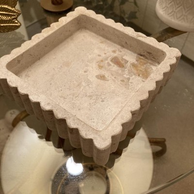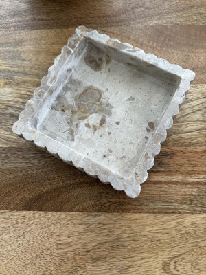 This little catchall is really nice. It's fairly heavy for it's size which is nice. Dimensions are approximately 5.5x5.5 and roughly 7/8" deep on the inside. As you can see it has nice ripples around the edges for an added designer touch. It's made of Fossil Beige Marble and is easy to clean by wiping with a damp towel. It also comes with nice little rubber feet to protect whatever counter you have this sitting on. I recommend this product for a simple yet stylish catchall or for just a little decoration.