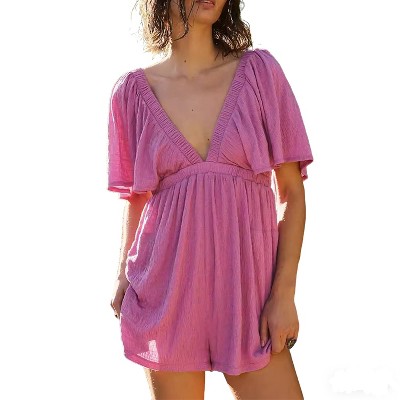 • Fit & Design: Deep V-neckline; bold open-back detail; short ruffled sleeves; flowy loose-fit shorts – creates a relaxed, flattering silhouette with eye-catching, playful accents.