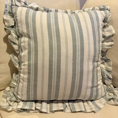 Add a decorative accent to your space with this Woven Stripe with Ruffle Blue and Ivory Square Pillow from Threshold Designed w/ Studio McGee. This 20-inch square throw pillow features an ivory base with a woven striped pattern in blue shades and complemented by playful ruffled edging for a charming look that works beautifully on any sofa, bed or armchair. Crafted with a linen-cotton blend exterior and filled with 100% polyester fiber, it provides cozy warmth wherever you place it.