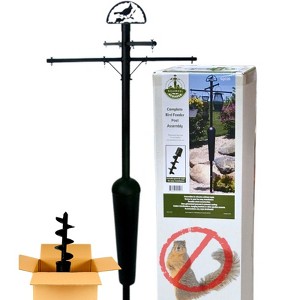 SQUIRREL STOPPER DELUXE BIRD FEEDER MOUNTING POLE Stop squirrels cold! This pole system is 100% squirrel proof! An ingenious, squirrel-stopping baffle is built right in--the center cylinder rocks from side to side and floats up and down. Squirrels can't grab onto it or climb past it.A screw-in auger is included to hold the pole firmly in the ground, and assembly is fast and easy: no tools required!The Squirrel Stopper Deluxe stands at about 8 feet tall when fully installed into the ground. The feeders will hang at around 6 feet to 5 feet high off the ground.There are four hanging stations 4" from main center pole and another 4 stations that are 16" from center pole.Assemble your pole quickly:Set auger onto ground and screw lower section into ground. Twist and lock middle section with attached shroud onto lower section.Slide 1" horizontal tubes through holes in top section. Twist and lock top section onto middle section.Your Squirrel Stopper includes: Decorative cardinal top or finial top, top holder, 2- 1" outside diameter cross tubes, 4- eyebolts and nuts for hanging feeders, 3- 3' x 2" outside diameter tube sections with "twist and lock" attachments, Squirrel Stopper shroud (factory-attached to middle tube section), Steel AugerHang your bird feeders and start feeding ONLY the birds! More Birds! NO Squirrels! Product manufactured in China. ** Please install the pole system 10 feet from poles or walls to prevent squirrels from jumping onto feeders. **