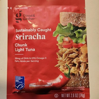 A go-to for salads, sandwiches, or a simple, wholesome snack, this Chunk Light Tuna in Water with Sriracha from Good & Gather™ is sustainably wild-caught and sourced using dolphin-safe methods. It's ready to enjoy straight from the pouch with a spicy, tangy sriracha kick.