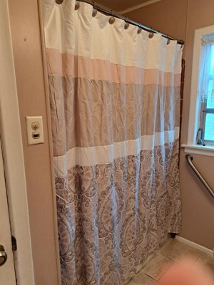 [This review was collected as part of a promotion.] I put up my new shower curtain and it looks so GREAT!! The soft warm pastel colors are so pretty. My bathroom colors are a soft light brown and the light rose color in the curtain really looks good. The embroidery is a nice pattern. I am super pleased with my choice.