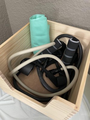 This stackable bin is a very nice quality item. It is smooth and solid considering the lightweight wood material. It has raised feet that prevent it from shifting if stacked. It is so nice that I’m using it to store my exercise/physical therapy equipment.