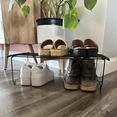 Keep your footwear organized with the Stackable Single Shoe Rack from Brightroom™. This black shoe rack has a single, open shelf that holds two pair of shoes to help maintain a clean space. Made of a metal frame, this shoe rack is stackable to help you save space, and fits nicely along your entryway.
