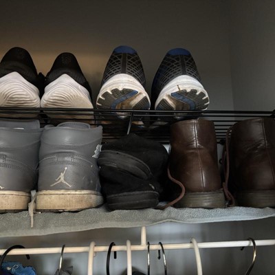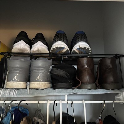 [This review was collected as part of a promotion.] I intended on using this shoe rack on the top shelf of our coat closet for some extra shoe storage. I wish the legs were a little wider so they don’t slip through the cracks of the shelf. It definitely works after putting a towel down under it but I’m not sure how long it’ll hold up like that. You can definitely fit more than three pairs of shoes too. Great quality and easy to set up. I received an incentive to write this review.
