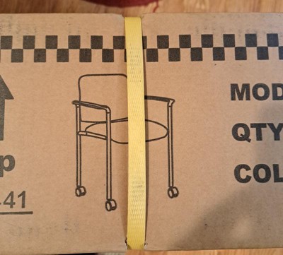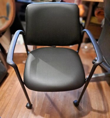 [This review was collected as part of a promotion.] I have a small home office and I love my Boss Square Back Diamond Stacking Chair! The seat and back are very comfortable to work at my desk and the rollers glide easily over my hardwood flooring and I really like the arm-rest. It was packaged very well and I only needed a philips head screwdriver to have it assembled in a very short time. It's nice and sturdy, classy looking in black vinyl and cleans easily with a damp cloth and since it's a stacking chair, you can stack up to 4! I'm very happy with my chair!