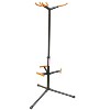 Steel construction with 3 hanger/holders for holding three guitars. Folding tripod base snaplocks into position. Surgical rubber on upper holder and lower lean brace. Height is adjustable 14.5-18.25. Base spread is 5. Black.