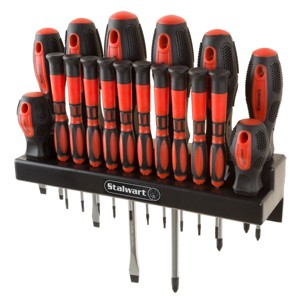 Perfect for "do it yourselfers" and professionals, the 18-Piece Screwdriver Set by Stalwart offers ultimate precision. These screwdrivers are made from high quality CR-V steel with non-slip grip handles and magnetic tips for strength, comfort, and accuracy. The included wall-mount storage rack can be hung on drywall or pegboard to help keep your garage or workshop organized. Stalwart, for tools for men and women that are SMART, STRONG, and SECURE.