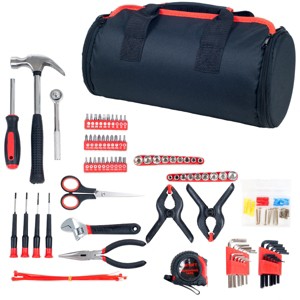 The Small Tool Kit by Stalwart has everything you need for basic repairs or little emergencies around the house. The 86-piece tool kit for home comes with 2 flat and 2 Phillips head screwdrivers, a hammer, measuring tape, needle nose pliers, an adjustable wrench, 2 plastic utility clamps, a dry wall anchor set, 10 zip ties, utility scissors, 10 SAE and 10 metric hex keys, a multi-bit screwdriver kit, and a ratchet set. This well-organized basic tool kit comes in a compact durable roll up carrying case that fits anywhere in your home, apartment, garage, or even the car.