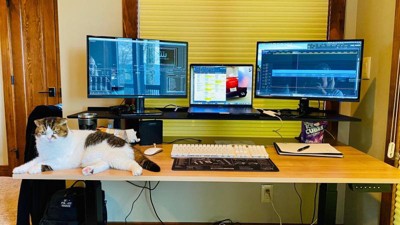 This is the second desk from The Stand Up Desk Store I have assembled and used. The quality is fantastic, there's plenty of room for my 34" monitor, laptop and other equipment. I think I'm going to get some rack screws and mount the mic processor in the metal next to the mixer. Love these desks! The price was right, easy to assemble and it feels great. If we ever get back to the actual office, we will be ordering them for all of the workstations in our department. (I also tied all the cables up since I took this picture!)