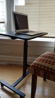 I am definitely glad I bought this desk. It's portable, fits my laptop and a cup of coffee and is sturdy. Pretty much exactly what I needed. The only downsides: ~In putting it together, it seems that not all the holes fit exactly to where the screws go. So it took a bit longer to construct and took two people. ~The knob that changes the height takes a lot of time/effort to unscrew and screw back in so I pretty much keep it at sitting height. ~The tray top seems to have a slight angle down towards the sitter. This isn't necessarily a downside, just something to be aware of. Again, for its "downsides" this is still a worthwhile desk, so I do still recommend!