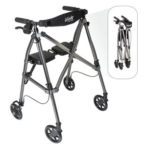 The Space Saver Rollator by Stander is the world's most compact and portable rollator. This walking aid combines functionality with style while providing you with balance and support to get around the house, run to the grocery store, or travel around the world! With just the lift of a finger, the Wonder Rollator seamlessly collapses to be three times smaller than the average walker. The patented EZ Fold-N-Go technology allows this travel rollator to easily be stored in the front seat of a car, in the overhead bin of an airplane, or kept discreetly at your side when eating at a restaurant. The folded footprint of 10 by 11 inches makes it easy for the rollator to stand on its own when not being used. The narrow design of the rollator allows it to comfortably navigate tight doorways and maneuver around furniture. With four six-inch wheels and an easy-to-use braking system, the 4 wheel walker can transport you across any indoor or outdoor surface. Unlike other walking aids for seniors, the Space Saver Rollator is lightweight, weighing just 14.5 pounds. The lightweight rollator with seat supports up to 250 pounds and has adjustable handles 33 to 36 inches high. With seven contemporary colors to choose from, the Space Saver Rollator by Stander is a stylish mobility aid you can be proud of!