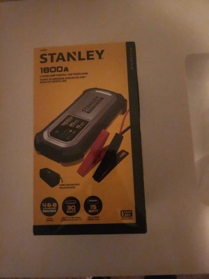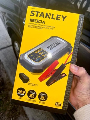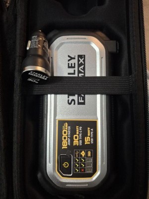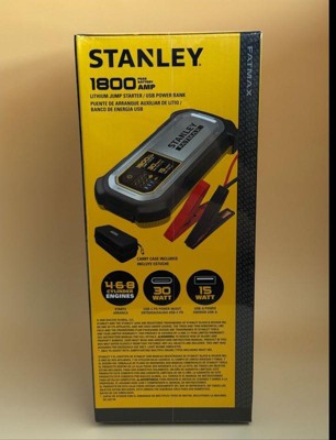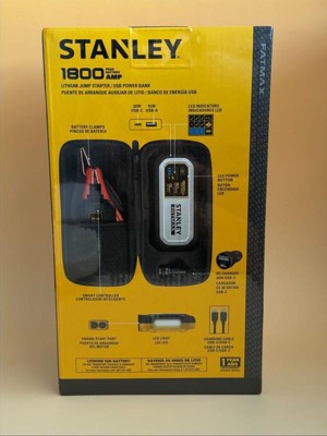 The STANLEY® FATMAX® LJ18FC 1,800-Peak-Amp Lithium Jump Starter is a portable jump starter and USB power bank in a small, take-along size. 1,800 peak amps of starting power instantly jump starts cars and trucks up to 8 cylinders. Powder-coated metal clamps are included. The reverse polarity protection assures jumper cables are connected correctly. The mini powerpack features USB-A (15 watts), USB-C® PD (30 watts), power in, and power out. The bright LED light helps with repairs after dark. It includes an attractive, handy carrying case and a 1-year warranty._