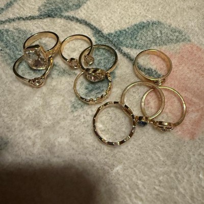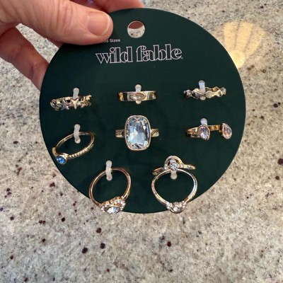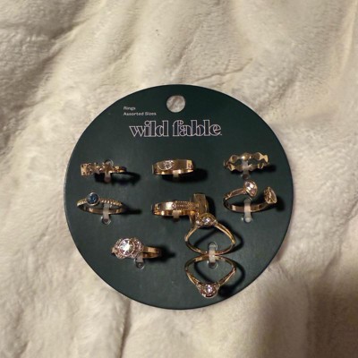 Eight-piece ring set from Wild Fable™. Includes eight different gold-finish metal rings in assorted sizes. Designs include a simple wavy ring, a star ring, and a variety of rhinestones in different colors.