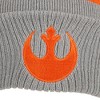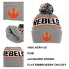 Show your allegiance in style with this gray Star Wars cuff beanie. Featuring an embroidered Rebel Alliance logo on the cuff, black “Rebels” text on a white stripe on the front and back, and a black and white pom, this beanie adds a heroic touch to your cold-weather look. Crafted from acrylic knit materials with a jacquard crown, it ensures lasting warmth and durability. This beanie is one size fits most. Hand wash it in cold water and lay it flat to dry for the best results.
