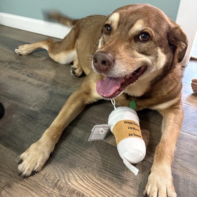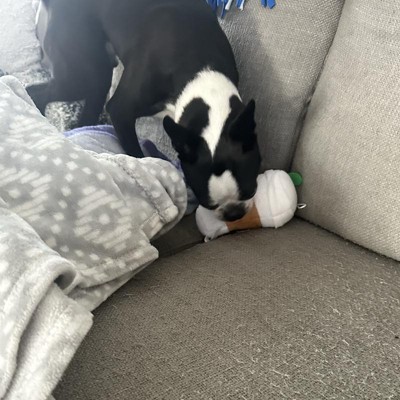 [This review was collected as part of a promotion.] This is a toy for my dog. I thought my younger dog would like this toy but she wasn't interested in it. The toy is well designed. Large enough for my dogs to pick it up in their mouth or hold it in their paws. Both my dogs didn't seem interested in this product. I would not be buying this product again. It has a small swatch of white netting connected to the tag, but I don't know what to do with it. I received an incentive to write this review.
