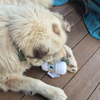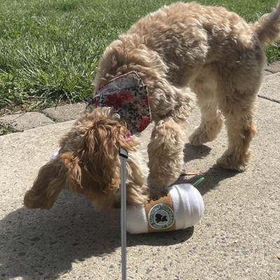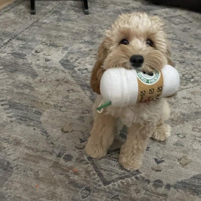 [This review was collected as part of a promotion.] This “coffee cup” dog toy has a really loud squeak and crinkle that my pup just loves! I was worried it would be too big as I ordered the size large but she can carry it in her mouth just fine, and she is a 14 pound pup. She did chew the felt “straw” off of it in one evening. Other than that the fabric feels really durable and like it should withstand intense chewing and tugging. I received an incentive to write this review.