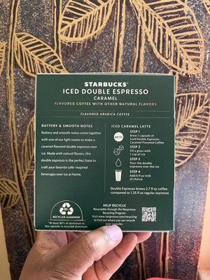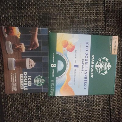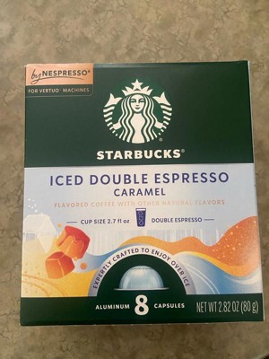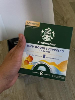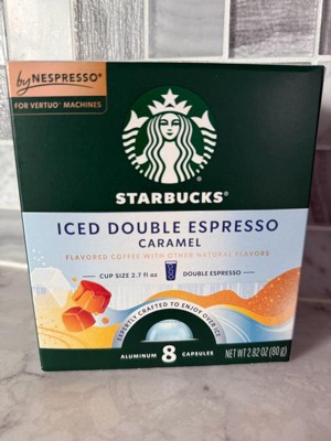 - STARBUCKS BY NESPRESSO PODS: Enjoy the Starbucks coffee you know and love with this 8-count box of Starbucks Iced Double Espresso Caramel capsules for Nespresso Vertuo machines