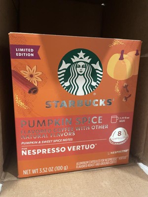 - STARBUCKS BY NESPRESSO PODS: Find fall flavors you love with this exclusive limited-edition 8-count box of Starbucks Pumpkin Spice Flavored Coffee Nespresso Vertuo machine capsules
