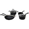 - Set includes 1.5 qt. sauce pan, 3 qt. sauce pan with lid, 5 qt. sauce pan with lid, 8 in. fry pan and 10 in. fry pan with lid