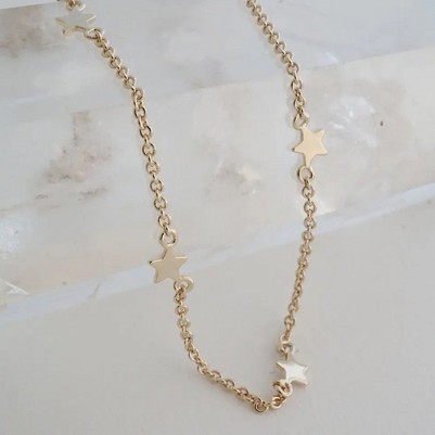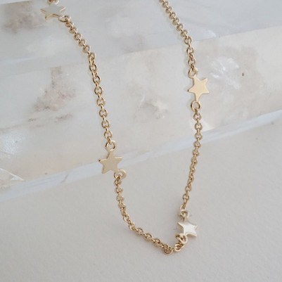 Tiny star charms perfectly spaced on our classic whisper thin chain. These confetti like pendants catch light in brilliant little flashes with your every move. So lightweight and comfortable to wear, it's easy to add this delicate, versatile piece to your everyday style. Wear it solo or layered as a choker or the perfect length necklace. Length: Adjustable between 14" - 17.5". Charms: 4mm tall.