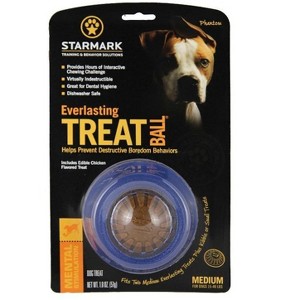 Two medium Everlasting Treat Balls each for dogs between 15 and 40 lbs. The ball's material is stronger than rubber and is great for powerful chewers. Despite it's durability, the ball is free of latex, vinyl, and phthalates. The chew ball can fit up to two domed Everlasting Treats and the ball encourages play which helps reduce anxiety and boredom behaviors. Use smaller treats for an added challenge.