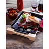 The perfect serving dish. You can cook anything in this rectangular dish, whether you want to do steaks, to roasting veggies, to casseroles or desserts, this dish can go straight from the stove or oven to the table with ease, especially since it comes with the wood base. A great look on any table, this is definitely a piece to use to serve for any dinner occasion.