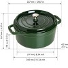 This size cocotte is the most ideal for 2-4 people and the basil color is outstandingly gorgeous. It is a nice color to bring out for the holidays especially. Cook, bake and present your yummy dishes in this perfect cocotte.