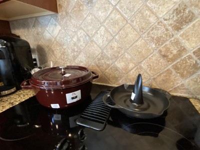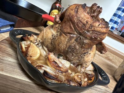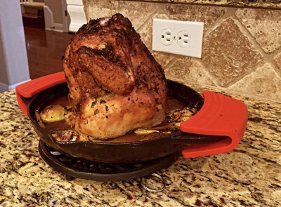 Chicken that is cooked vertically is always moist and flavorful. This cast iron roaster helps the chicken cook from the inside as well as the outside which equates to a quicker cook time and an even distribution of heat. The dish catches juices for perfect gravy drippings and the enamal coating makes for easy clean up.