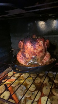 If you've ever had a chicken that looks beautiful on the outside but is under done on the inside, this roaster solves that problem, period. The cast iron carries the heat evenly to all parts of the chicken delivers a perfectly cooked, juicy bird. The bottom collects the juices for a pan gravy or au jus. It is perfect. Brine the chicken for the best results. Dishwasher safe for easy clean up.