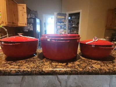 This big boy is the perfect size for my large extended family. Love the dark interior, which aids in caramelization and creates the perfect sear on meats, and poultry. The heavy flat lid, with dimples on the inside, really hold on to all those juices, and does all the basting needed for moist roasts and poultry. Love that it can be used on all cook tops, including my portable induction hub that I use outside when I want to fry up some fish and chips, so that the odor does not remain in the house. Also oven safe up to 500 degrees which is useful when browning the bread crumbs on top of the macaroni and cheese casserole I use this pan for. Really satisfied with the quality of this dutch oven, and look forward to adding additional pieces to my collection.