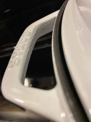 This is the second white cocotte from Staub I’ve purchased that was missing the white coating on the handles. My friend also had the same issue. I returned. Makes me question the quality checks.