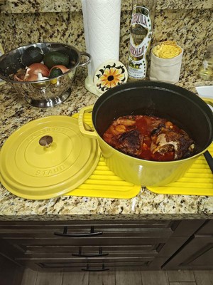 The Staub cocotte is unsurpassed for slow-cooking meats and vegetables to tender perfection, and for simmering hearty stews and soups. Cast iron possesses exceptional heat-retaining qualities, so the pot heats evenly throughout. The innovative lid features tiny spikes on the interior that continually release condensed liquid back onto the food, yielding moist, flavorful results.Staub's special matte black enamel interior and self-basting spiked lid guarantee perfect browning and braising for flavor-enhanced food. With their exquisite enamel finish, each piece transitions beautifully from the kitchen to the table. From comfort food to sumptuous suppers, every dish is special when served in Staub.Staub enameled cast iron cookware is the choice of the world's best chefs. With exceptional durability, it is perfect for day-to-day use in both gourmet home kitchens and prestigious restaurants around the world. Built to last a lifetime, these heirloom pieces can be passed from generation to generation.
