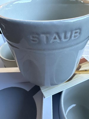 I purchased the white truffle line to match my utensil holder. The cups are beautiful—not too heavy, but still quite stable to use. They’re a nice size (16 oz) for making coffee or tea. However, one of the mugs doesn’t have a very clear 'Staub' logo on the side; it’s almost not visible. I wish it were darker and thicker, like the other cups in the set.