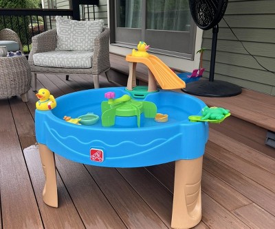 Quack, quack! It’s time to splash around with the Step2 Duck Pond Water Table™! Water table play not only fascinates little imaginations but also encourages sensory skills as kids squeeze the rubber duck and frog toys while splashing around in the water. Little ones can also take turns using the side flipper to see who can get the highest jump at their very own outdoor water activity center. Who can get the largest splash? Send the included duck and frog toys down the water slide, and make a big wave in the basin with the whirlpool spinner. Toddlers and preschoolers will have a blast with this pond-themed water table! The large water table design and included accessories make it easy to engage in fun social play with friends, and practicing sharing skills too! Made in the USA of US and imported parts.