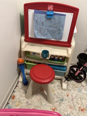 Spark creativity with the Step2 Flip & Doodle Easel Desk with Stool™! The lightweight design of this activity center set lets kids pull up their stool and get to work making their very own masterpieces. Medium and large-sized bins keep art supplies within reach, along with molded-in trays above and below the desk surface for extra storage space. Use the rear storage area to hold books, paper, notebooks, and more! Flip the desk surface up to reveal a magnetic dry-erase board and paper clip, great for upright use and to display artwork. Made in the USA of US and imported parts.