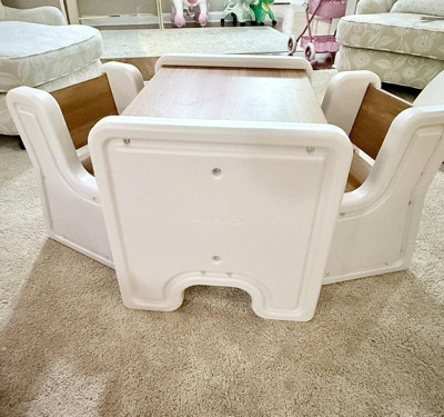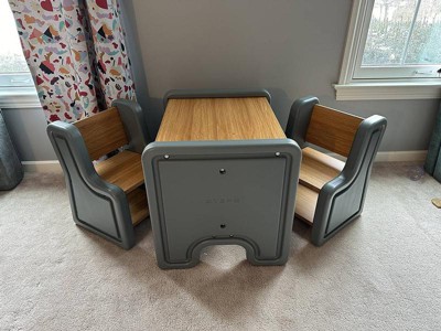 The table and chairs are VERY sturdy and is also easy to put together. My 3 kids (ages 2, 4, & 6) love sitting in them to eat, color, & play. I like how the edges are rounded and that there's a little spot for storing things under the chairs. I'm really happy with the quality, & the sage grey is a nice color too. We also got the Harmony Play Kitchen and love how it coordinates with the table and chairs.