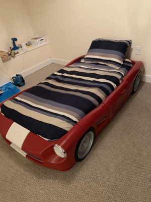 - Start with the toddler size bed, using your crib mattress. The crib mattress sits low to the ground, allowing the car walls to act as extra support to keep little ones from rolling out of the bed. When your child is ready, add the front and side panels to expand to accommodate a twin size mattress. Using a twin mattress only, the side walls continue to provide guardrail-like support. When guardrail support is no longer needed, optionally add a box spring to raise the mattress up higher.