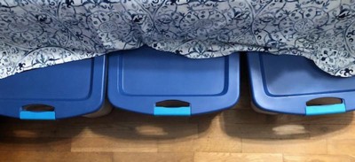I have had three of these storage boxes for a number of years. They are the perfect size and height, to get the most use of that space under my poster bed. The latches are great for making sure the lids don't get popped off, from be being a little extra full, and the handles are great for pulling out from under the bed. I have been looking for a couple more storage boxes this same height, but have had trouble finding any. I am tickled to find out that you have them in a store, that is forty-five minutes from my home. Please keep making these storage boxes. They are the perfect height and size for my needs, and I'm sure for many other people with the same style bed as I have.