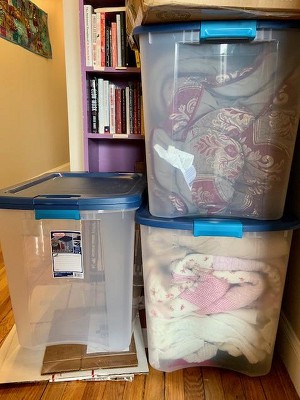 These durable storage totes are ideal for storing off-season clothing, sporting equipment, camping gear, pool or beach toys, and more safely in your home, garage, attic, or storage unit. They can also be used for tidying up your little ones' crafting materials and odds and ends or storing treasured knick-knacks and keepsakes. Whether you're safely storing and organizing everyday household items, off-season pieces, or long-term objects, you can easily identify contents from the outside, thanks to the clear plastic design.